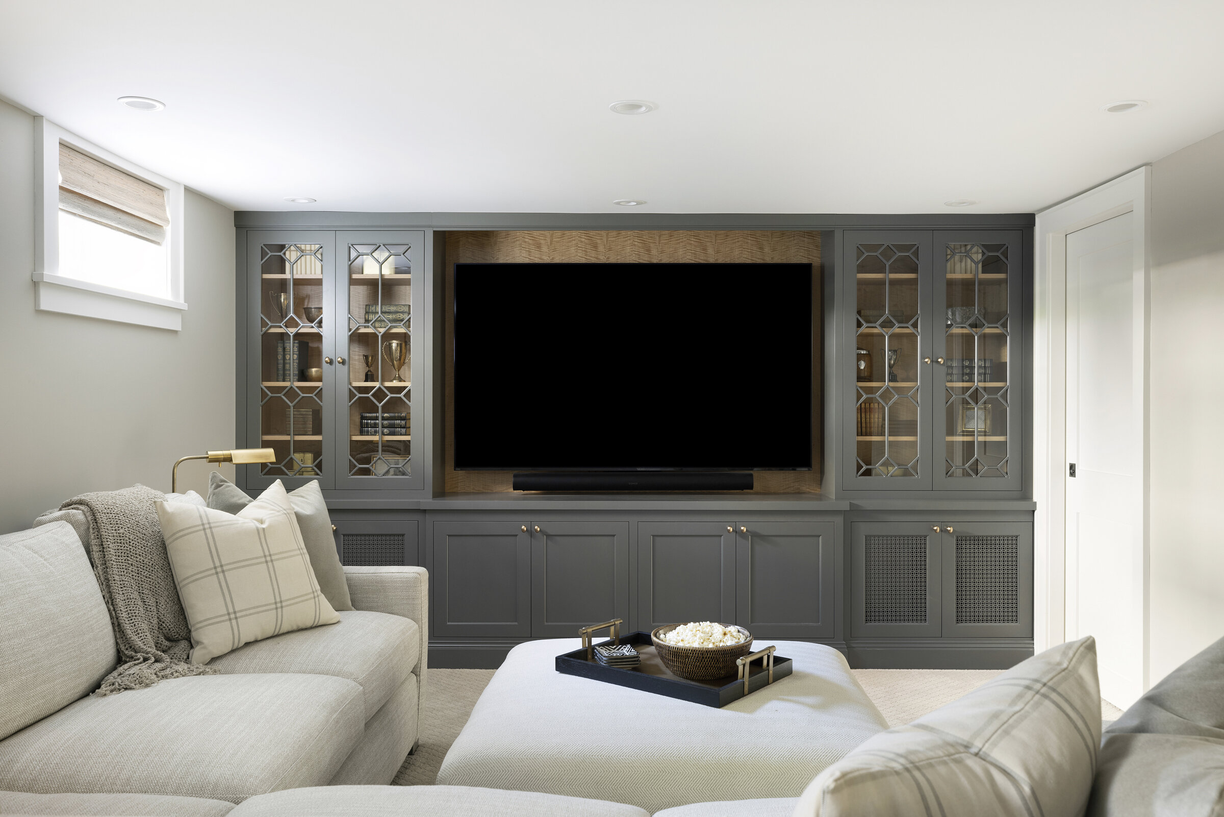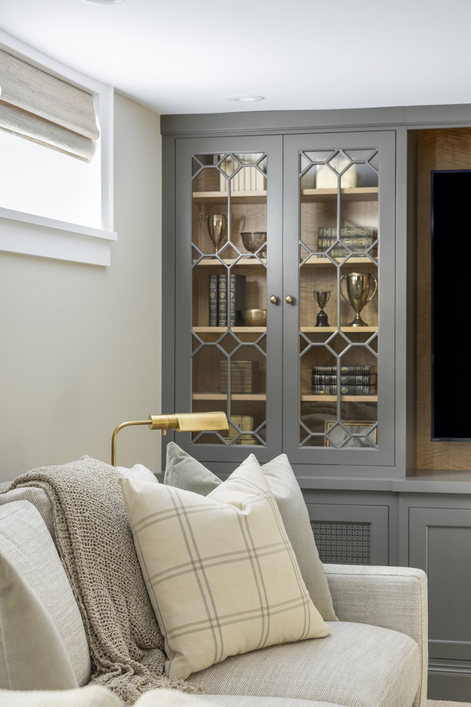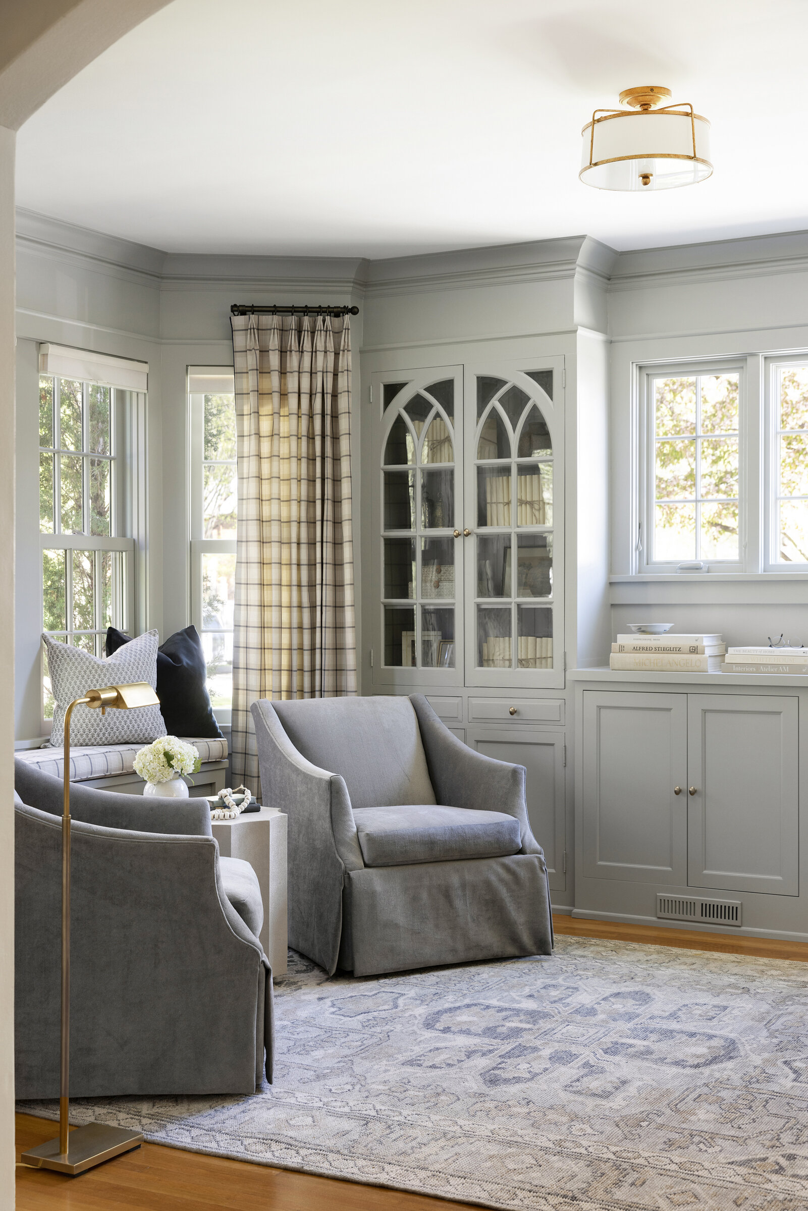 Plaid textiles, thoughtful vignettes, and wrapped bookshelves lend a collected feel—nothing overly styled, just beautifully considered. From the intimate window seat to the cozy lower-level lounge, every inch was crafted to feel intentional, elegant, and entirely livable.