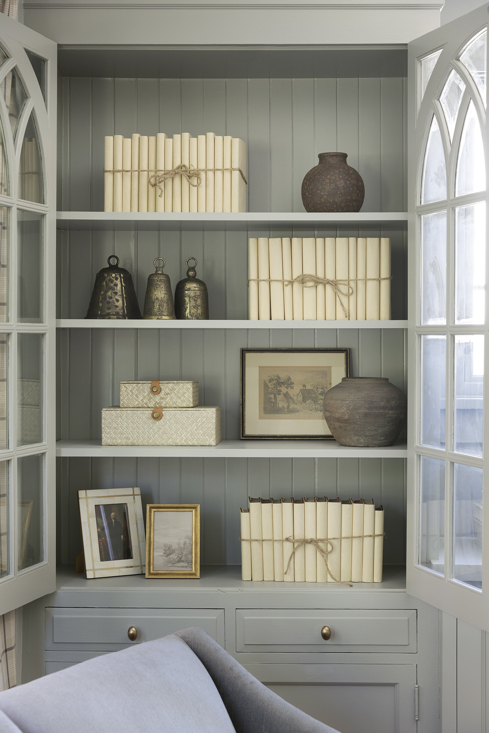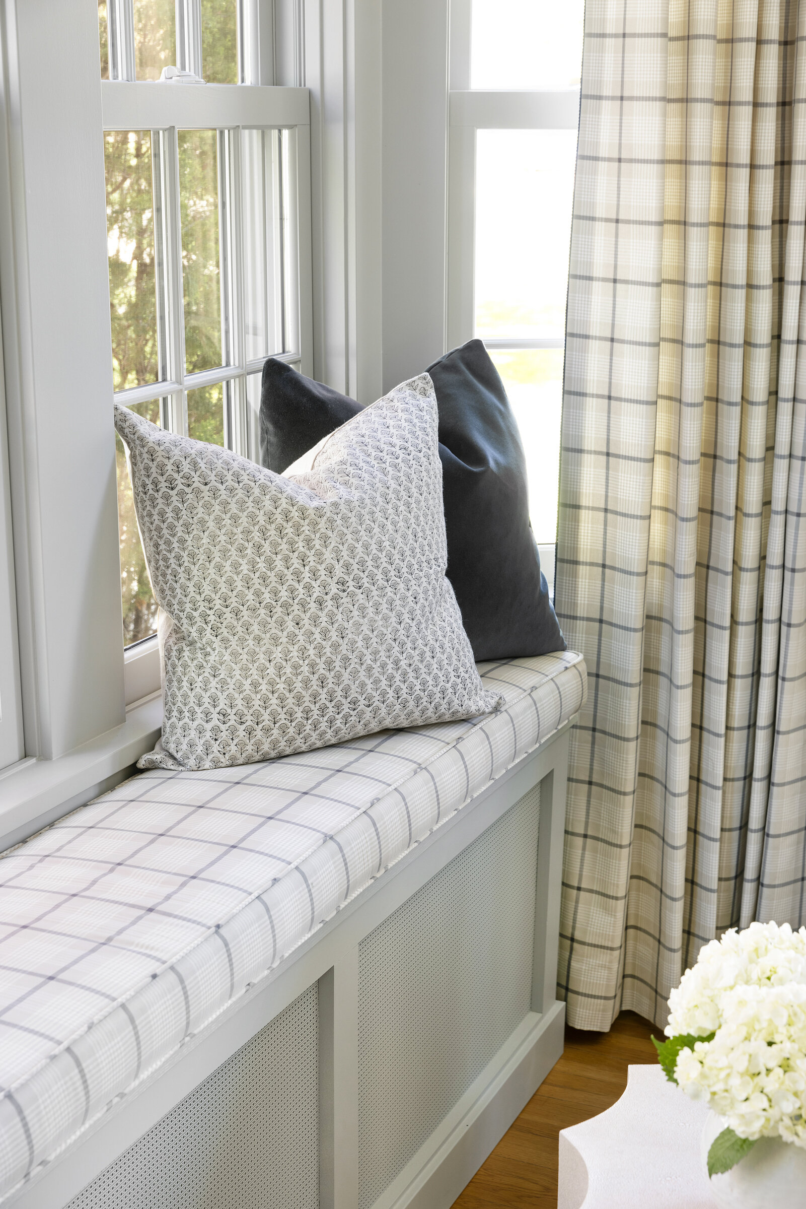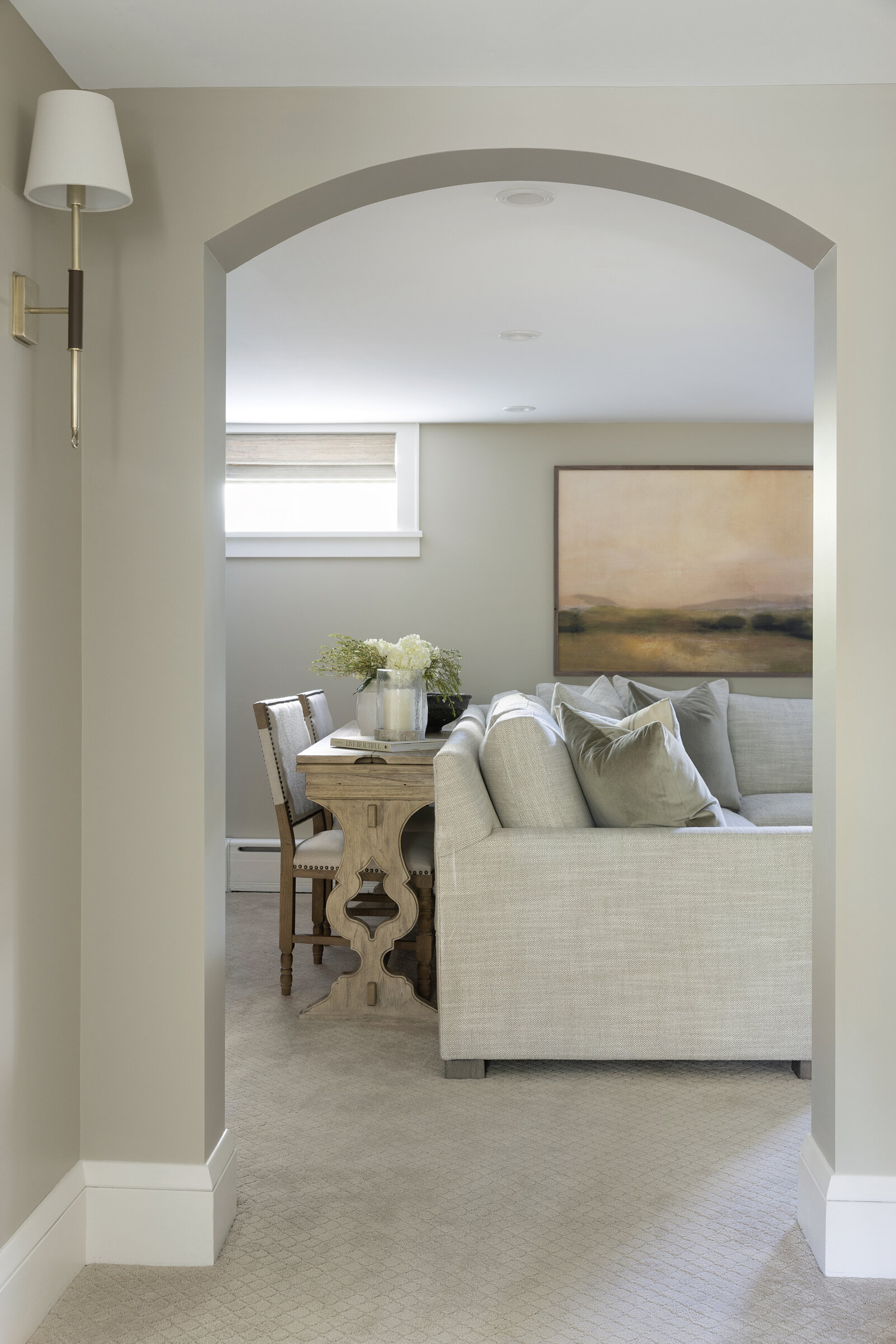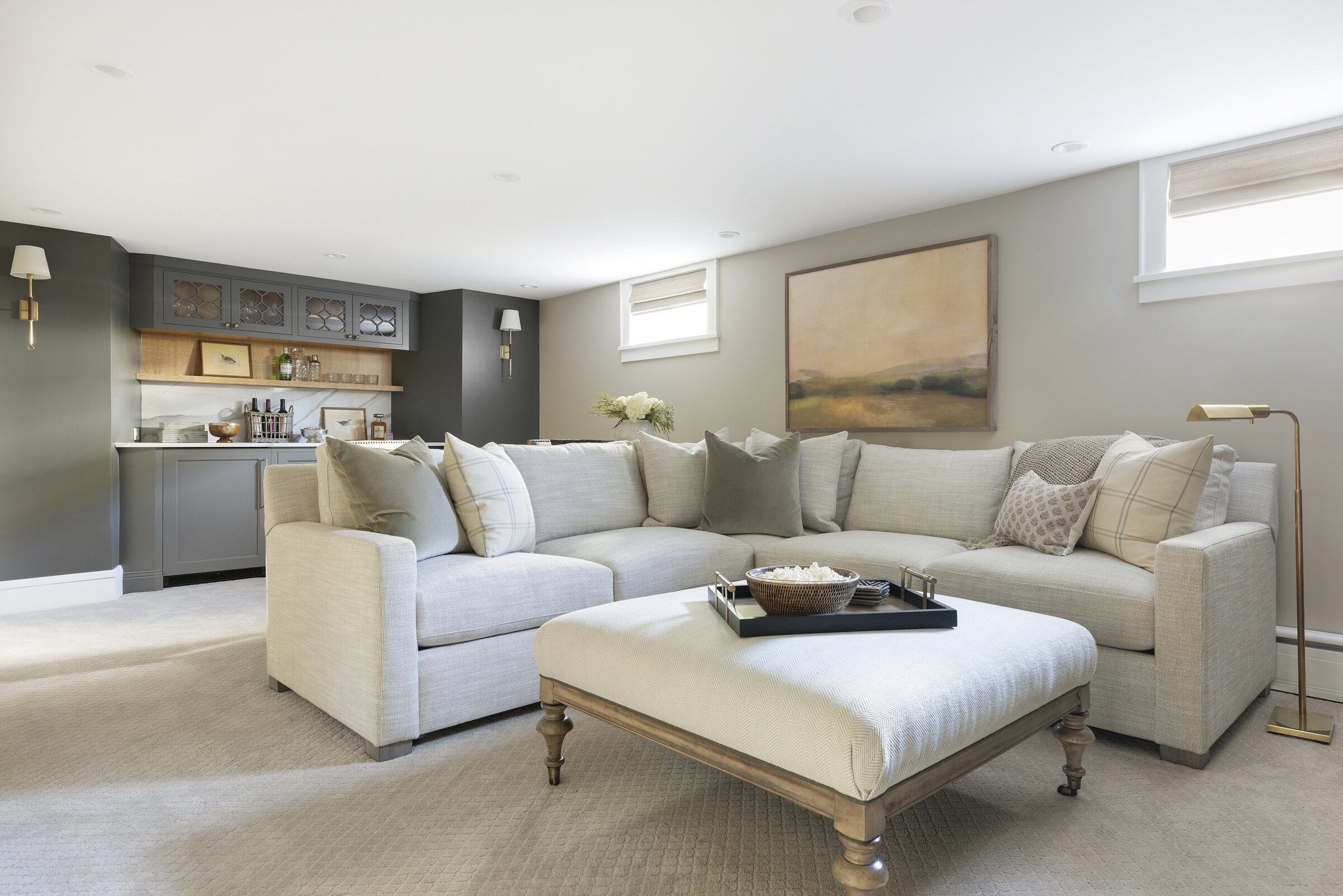 Plaid textiles, thoughtful vignettes, and wrapped bookshelves lend a collected feel—nothing overly styled, just beautifully considered. From the intimate window seat to the cozy lower-level lounge, every inch was crafted to feel intentional, elegant, and entirely livable.