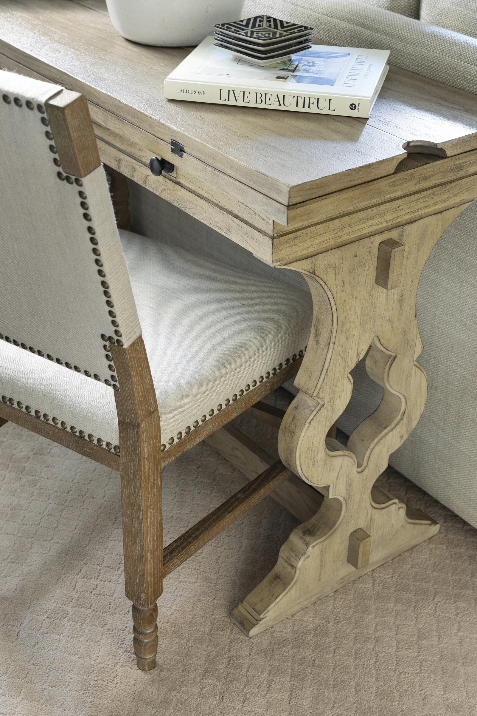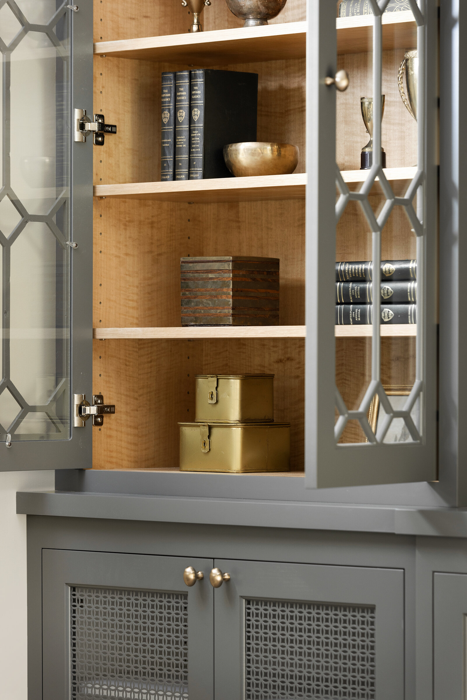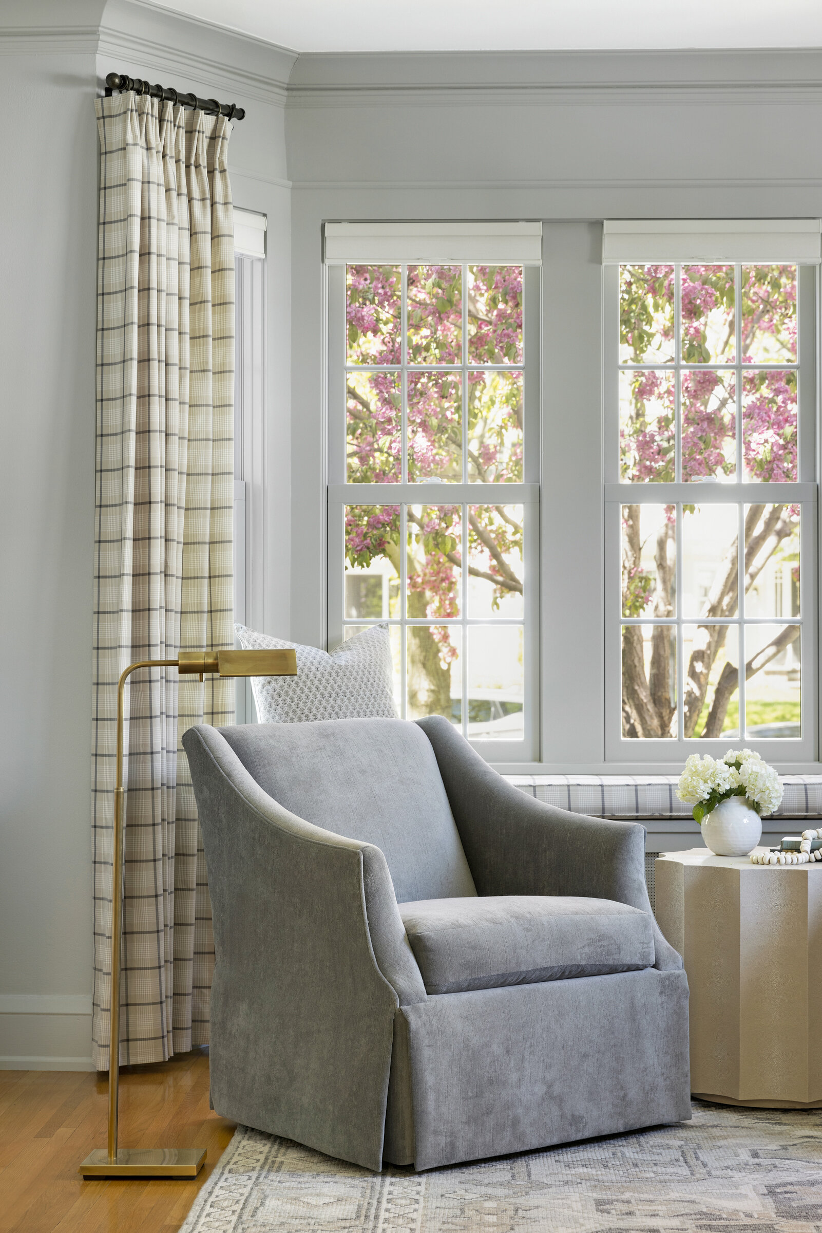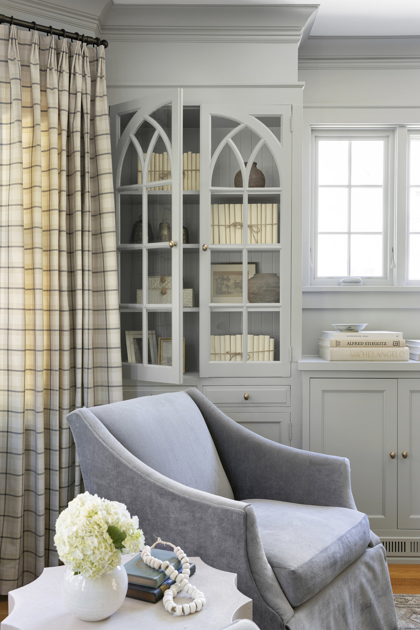 Plaid textiles, thoughtful vignettes, and wrapped bookshelves lend a collected feel—nothing overly styled, just beautifully considered. From the intimate window seat to the cozy lower-level lounge, every inch was crafted to feel intentional, elegant, and entirely livable.