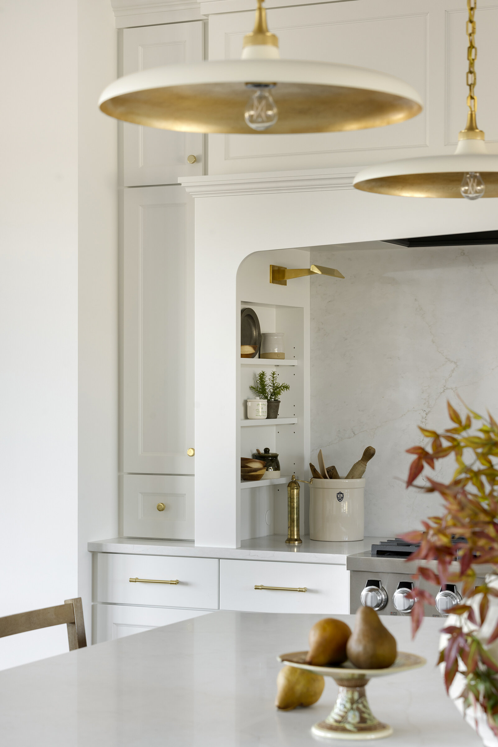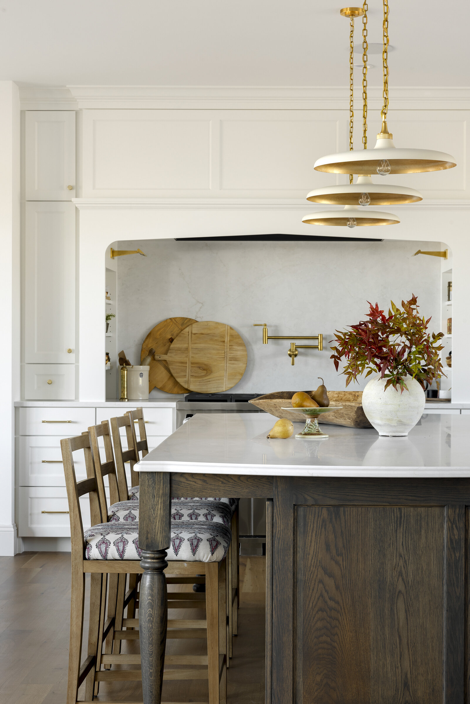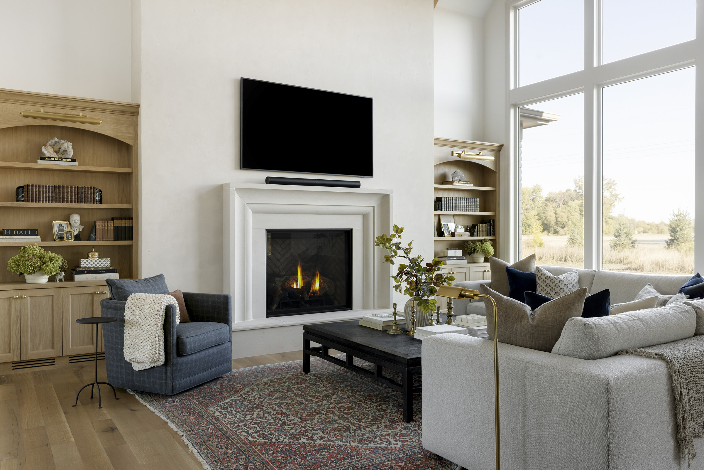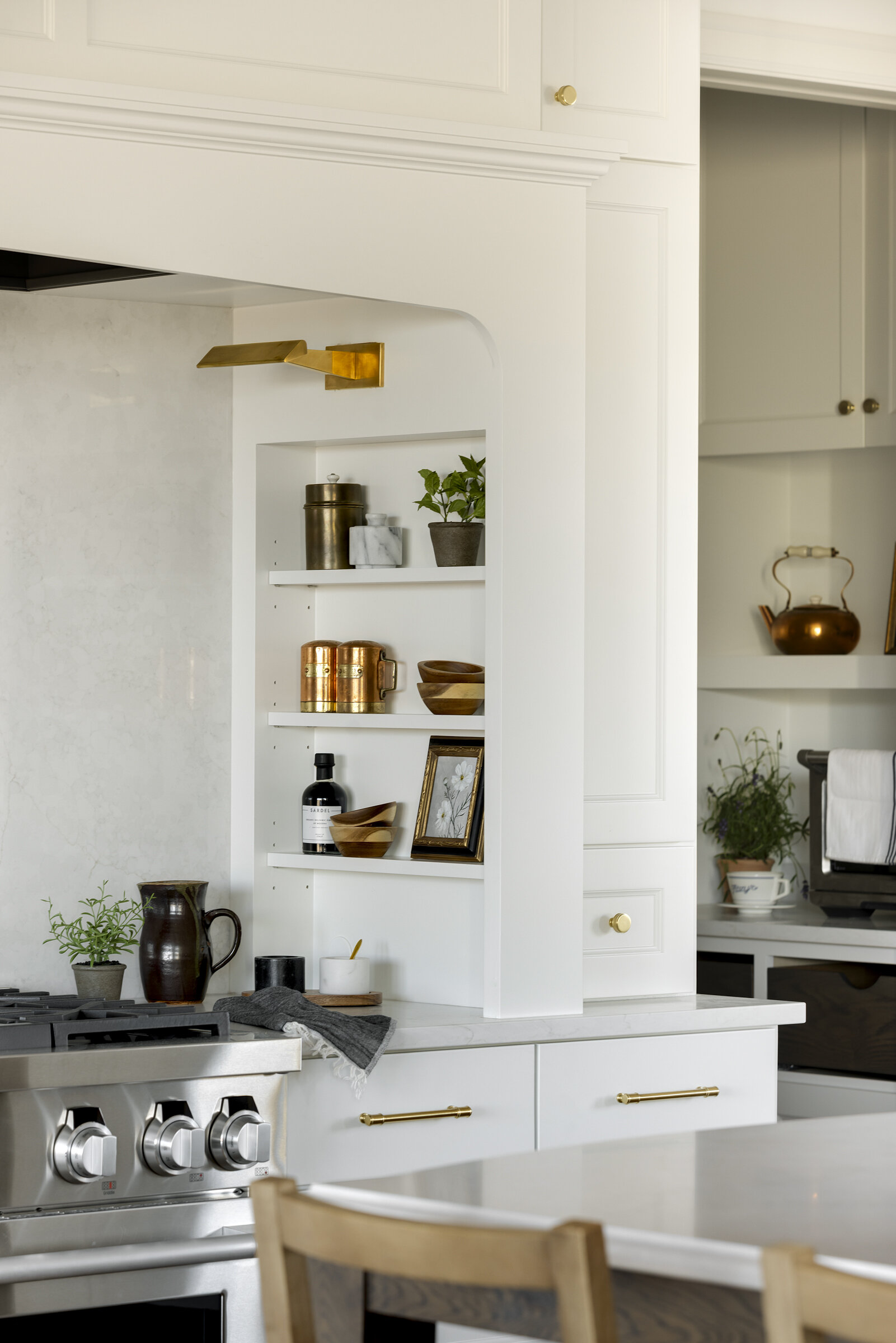 This home captures the perfect blend of modern and classic interior design. In the kitchen, a subtle arched hearth softens the architecture and plays beautifully against the clean, modern lines of the sconces inside it. The custom island detailing adds depth and craftsmanship, grounding the space with warm, timeless character.