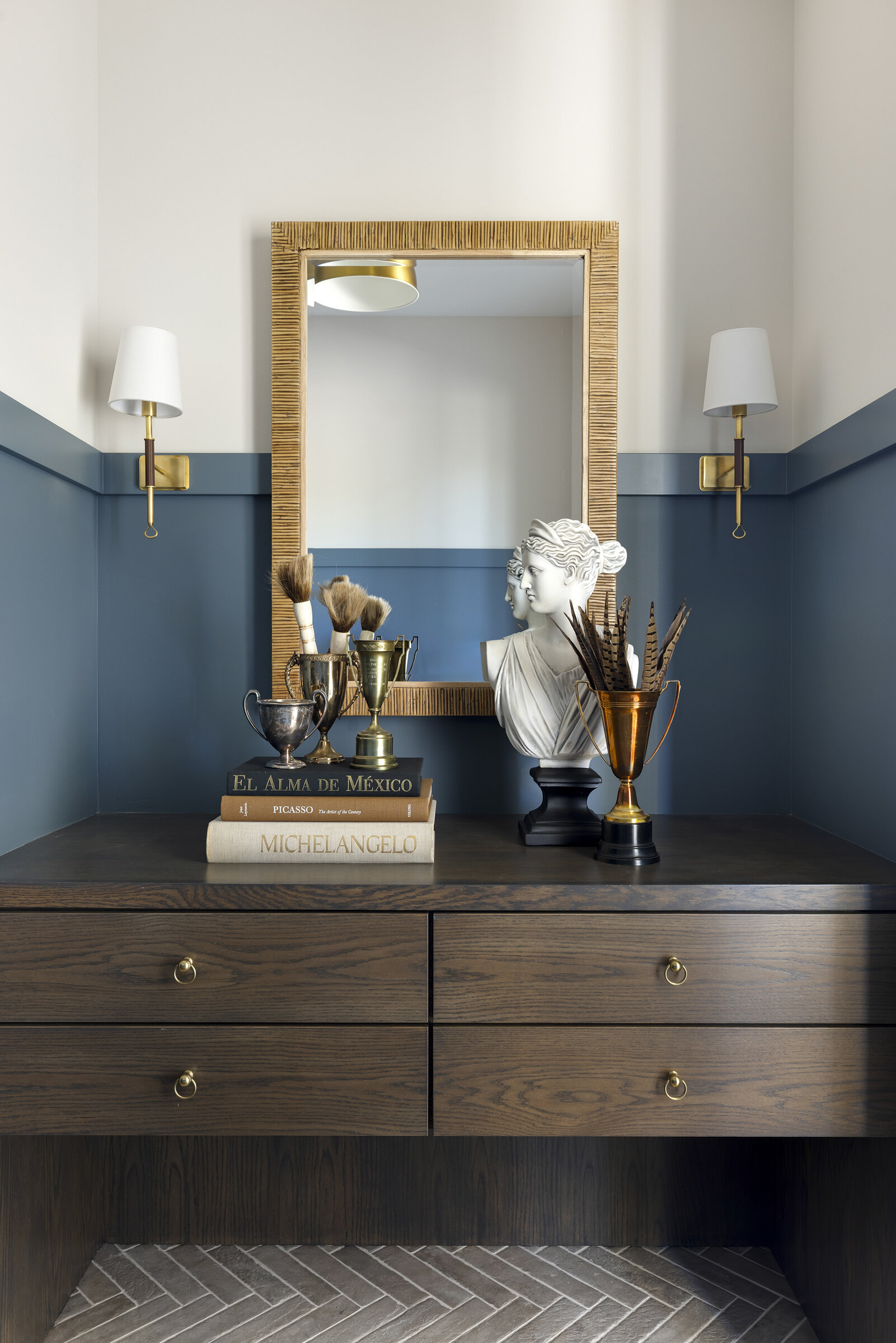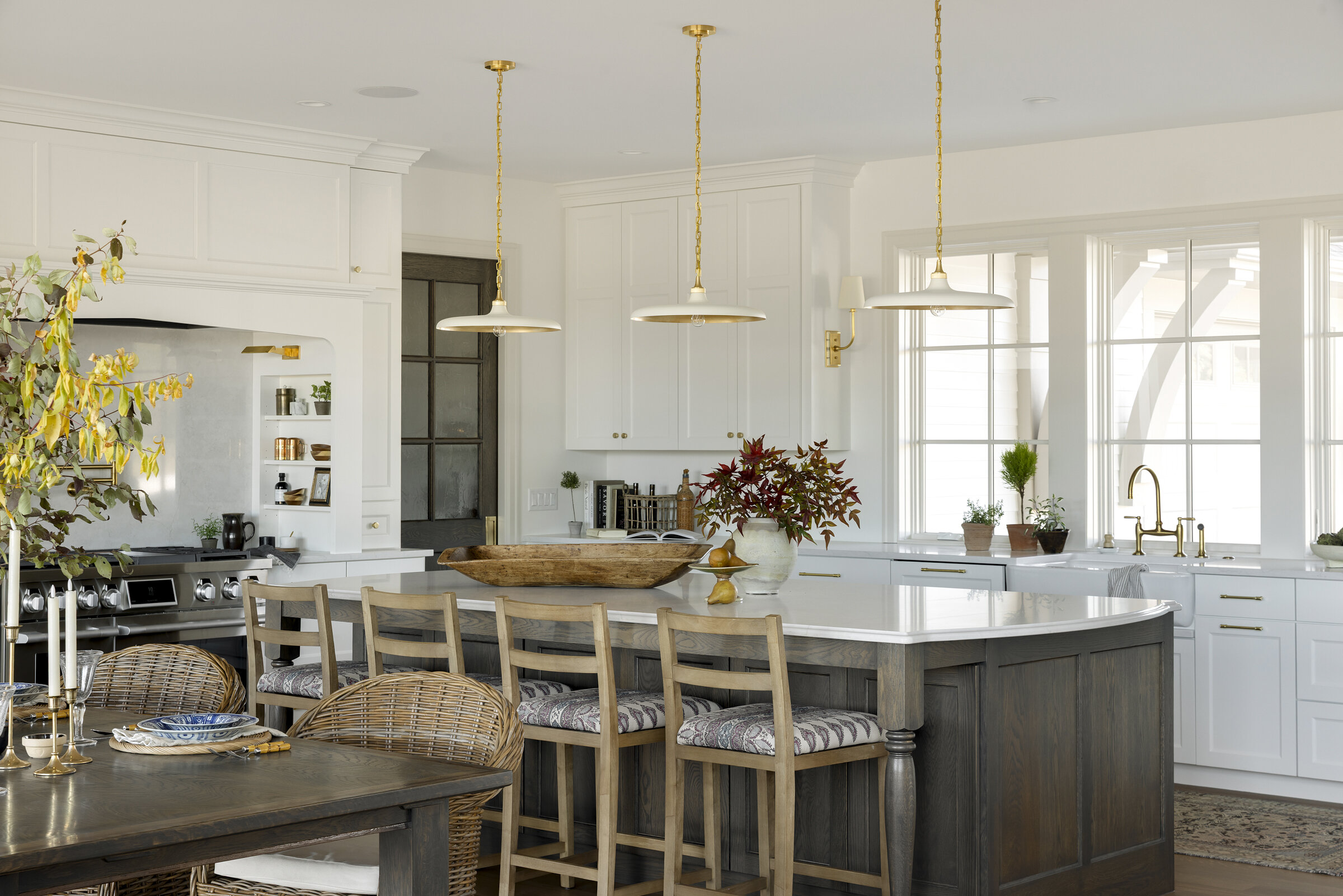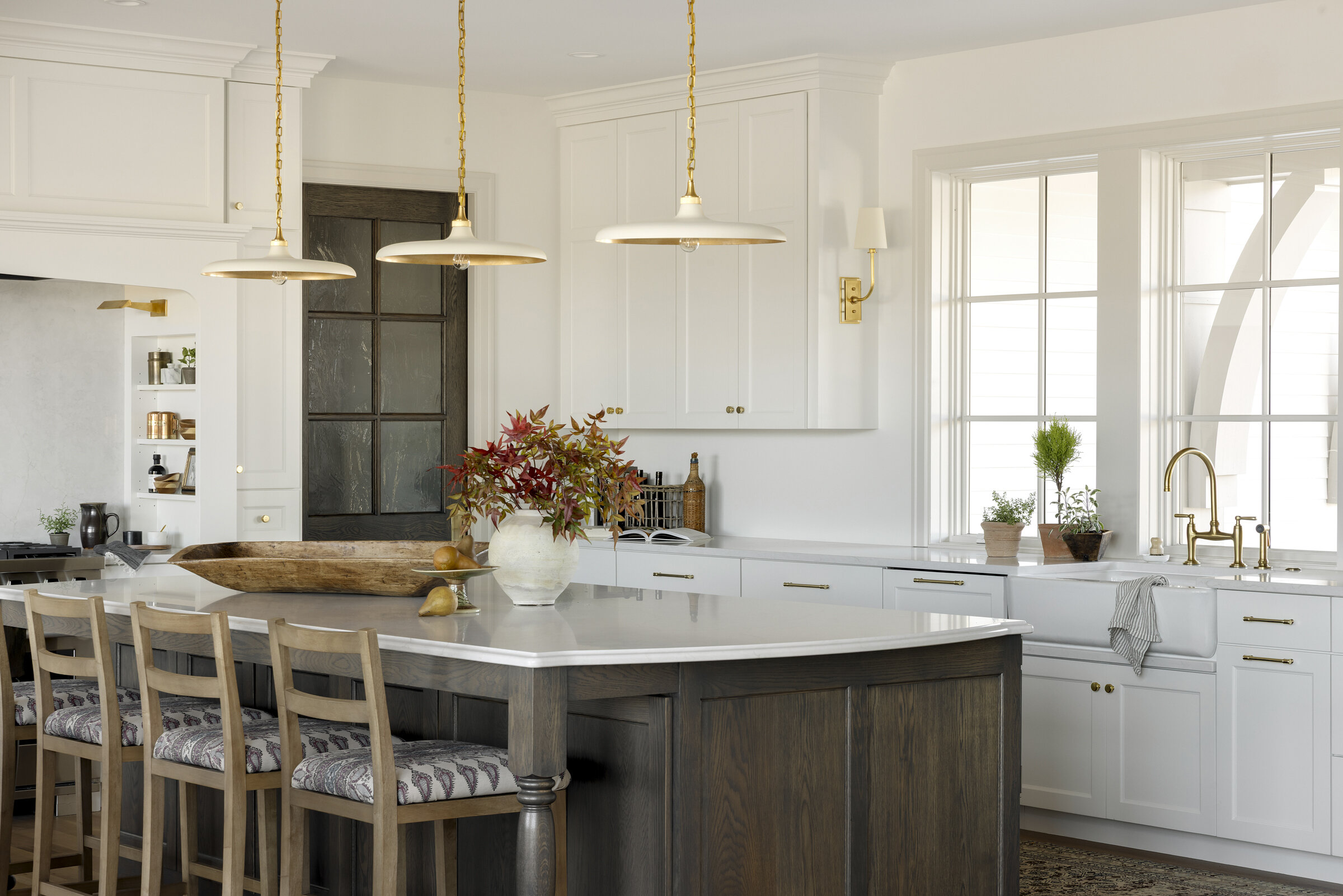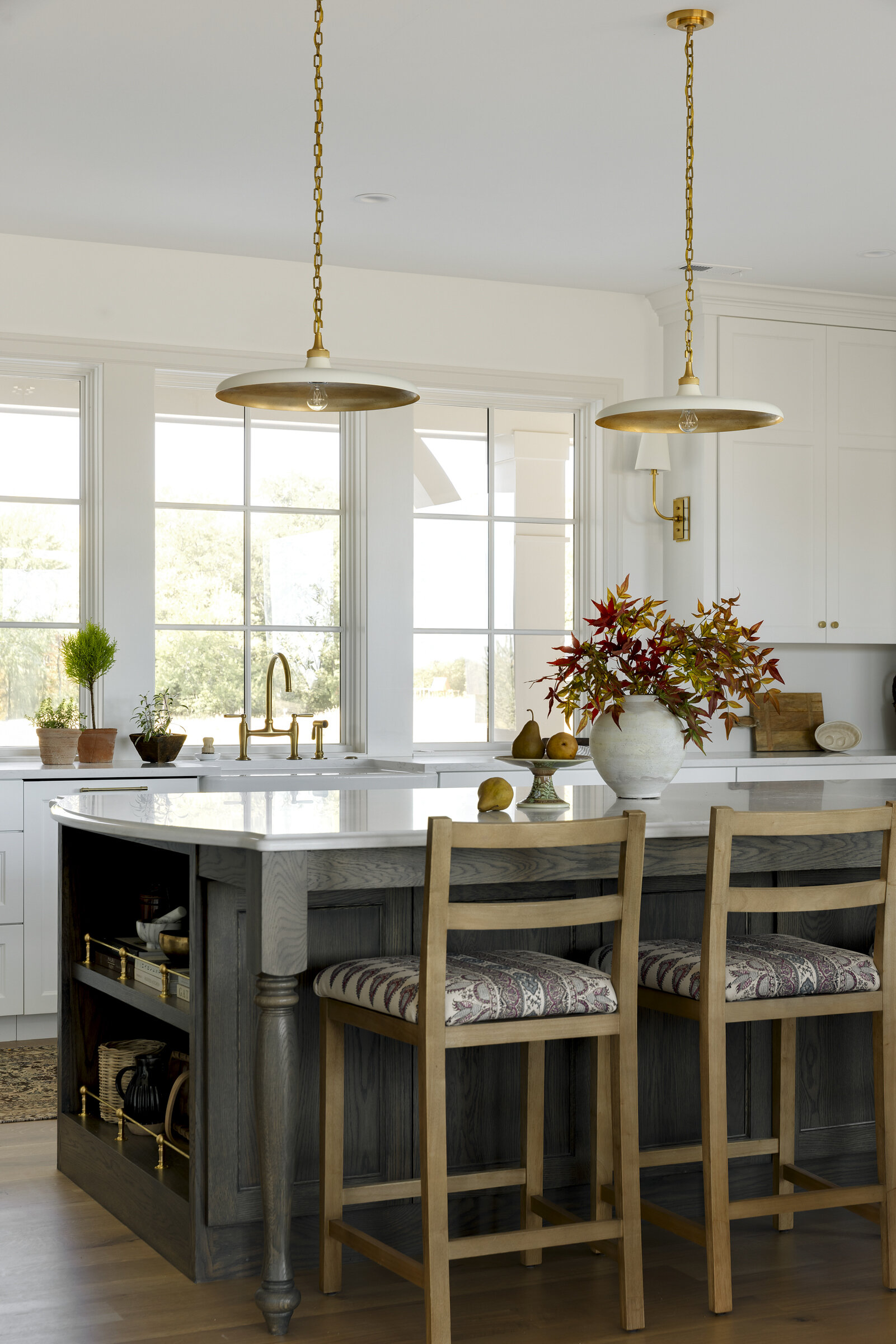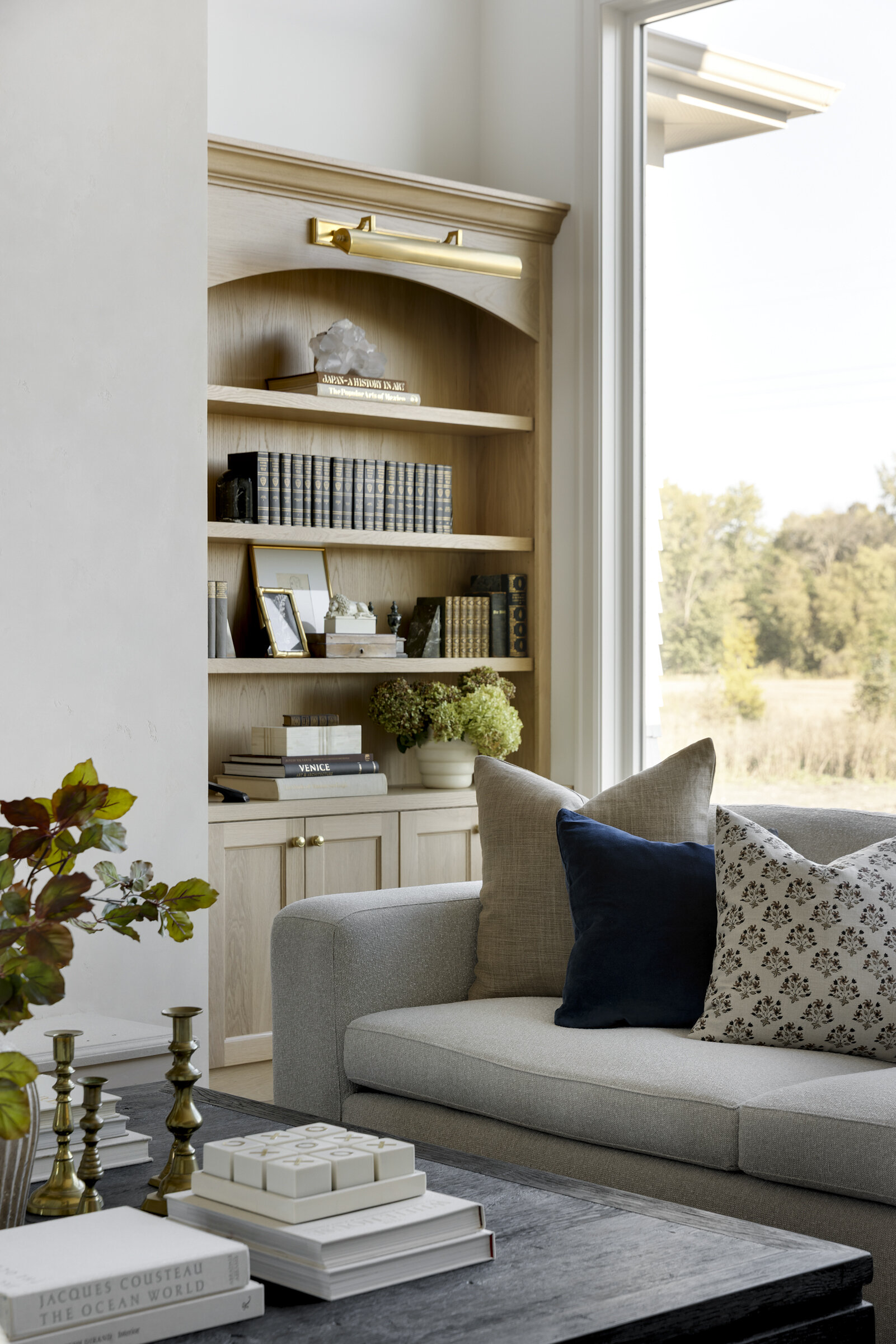 This home captures the perfect blend of modern and classic interior design. In the kitchen, a subtle arched hearth softens the architecture and plays beautifully against the clean, modern lines of the sconces inside it. The custom island detailing adds depth and craftsmanship, grounding the space with warm, timeless character.