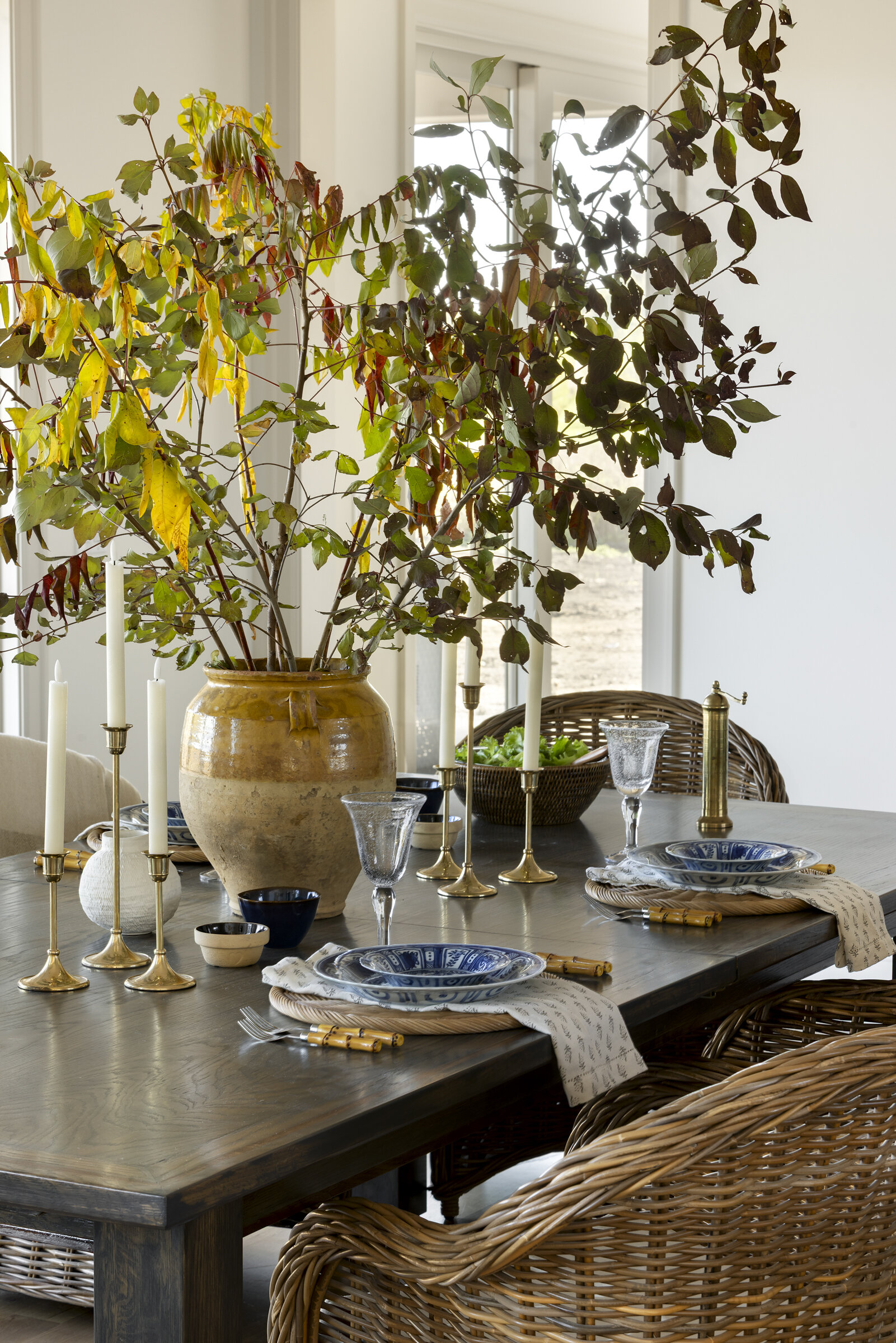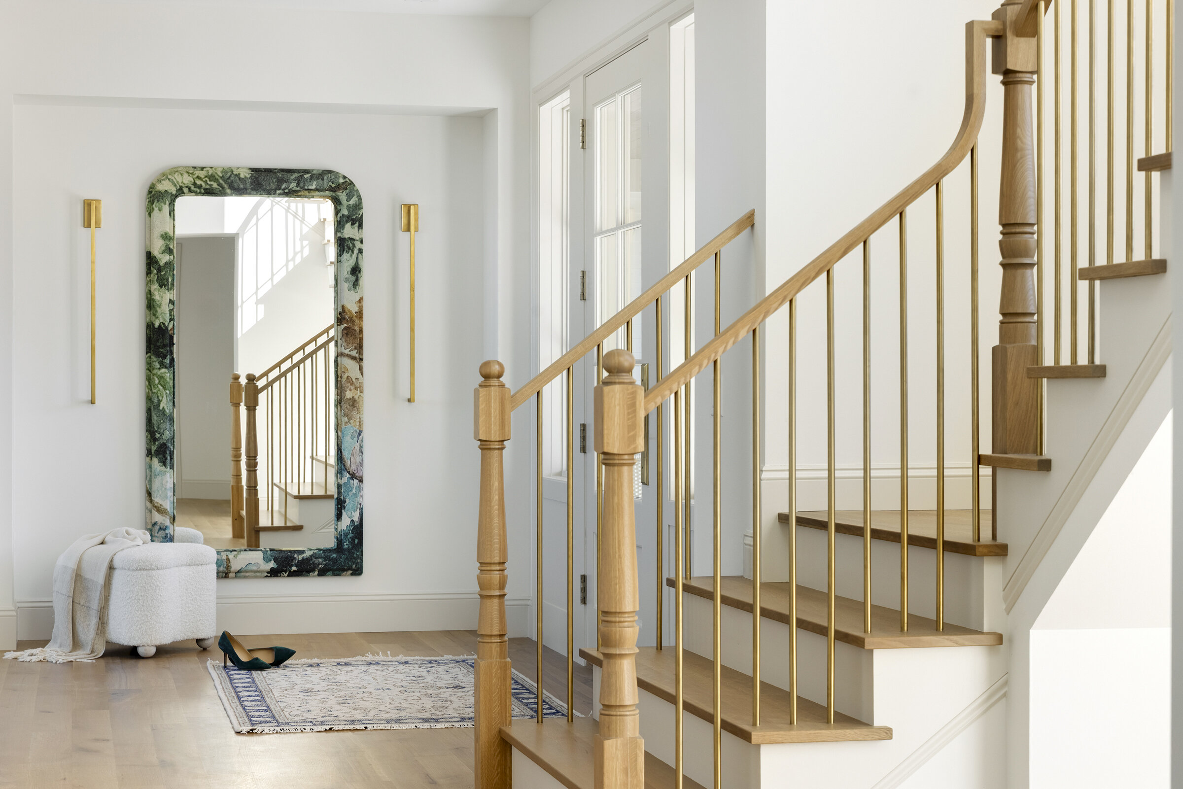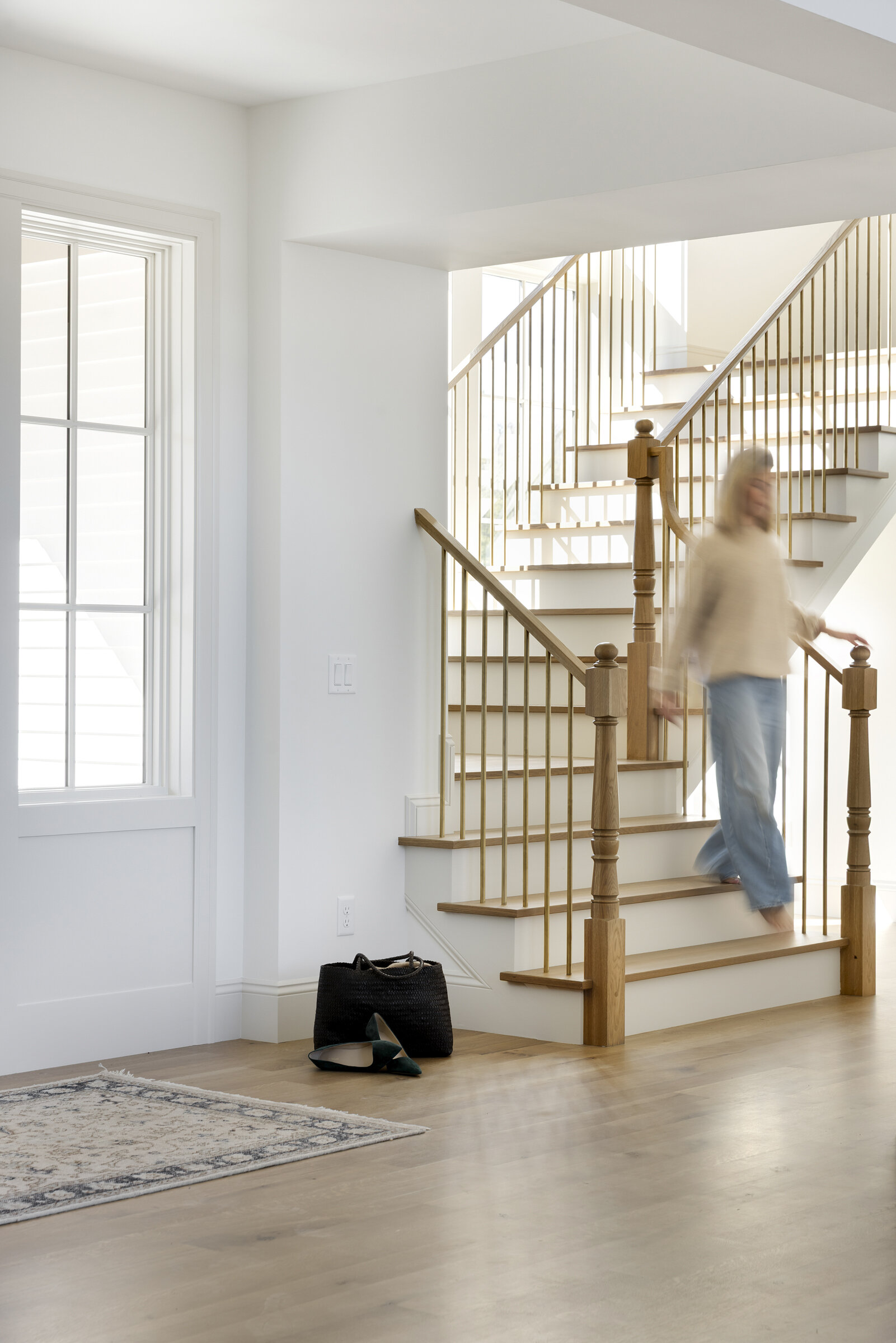 A plaster fireplace wall brings a relaxed, quiet elegance to the living room, adding natural texture without overpowering the modern design elements. Throughout the home, thoughtful moments—like the delicate brass spindles on the staircase—introduce refined detail and a touch of classic sophistication.